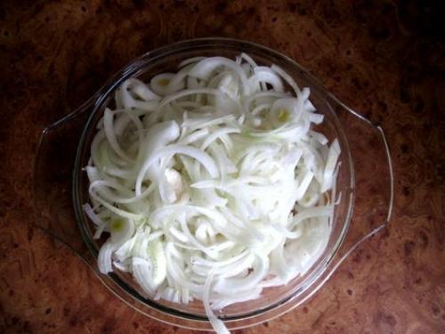Репчатый лук очистить от шелухи и тоже вымыть. Для того, чтобы во время работы с ним не текли слезы, можно лезвие ножа, да и сами головки периодически смачивать холодной водой . Лук необходимо нарезать полукольцами.